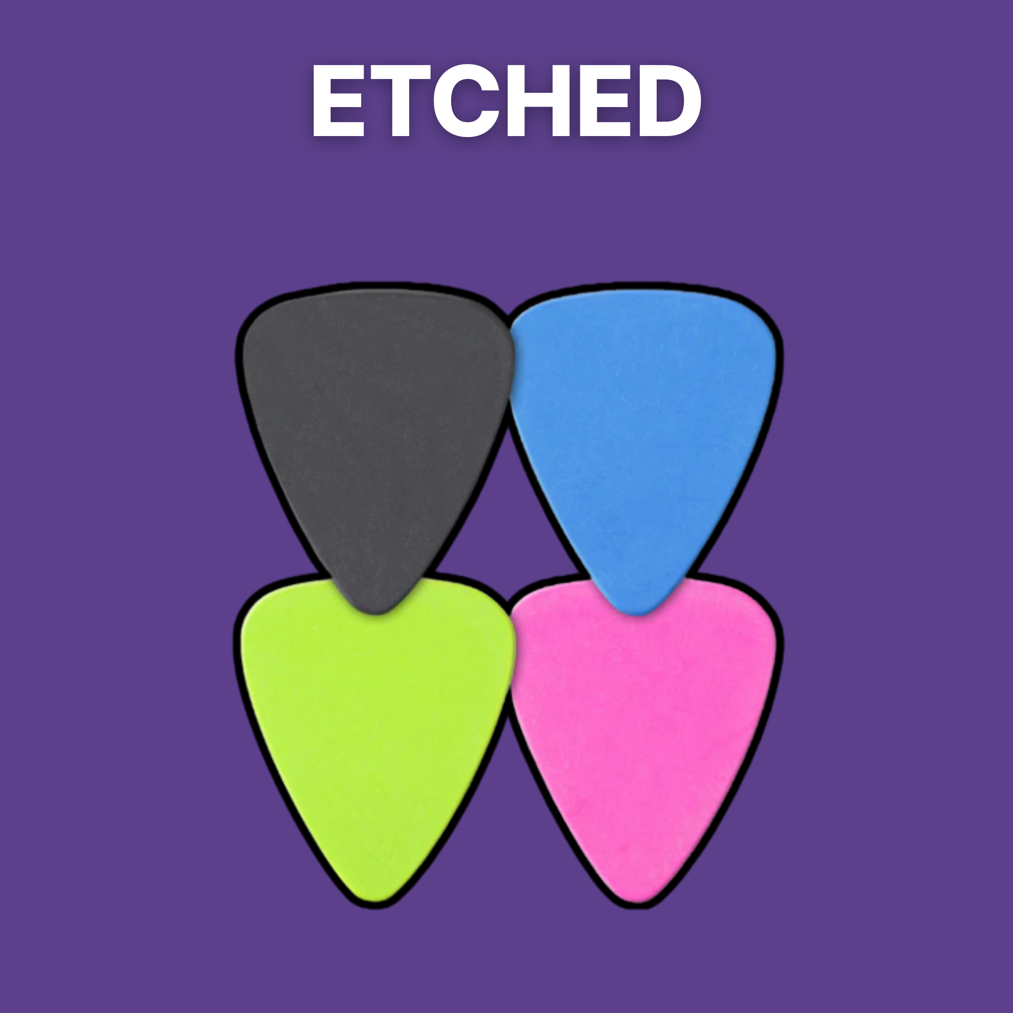 We take our Delrinex™ picks and Etch them using a proprietary process, this produces a pick with increased grip because your graphics are sunken into the surface. Works best with artwork that features large solid graphics and larger text. Choose from our Delrinex gauges, shapes and colours.