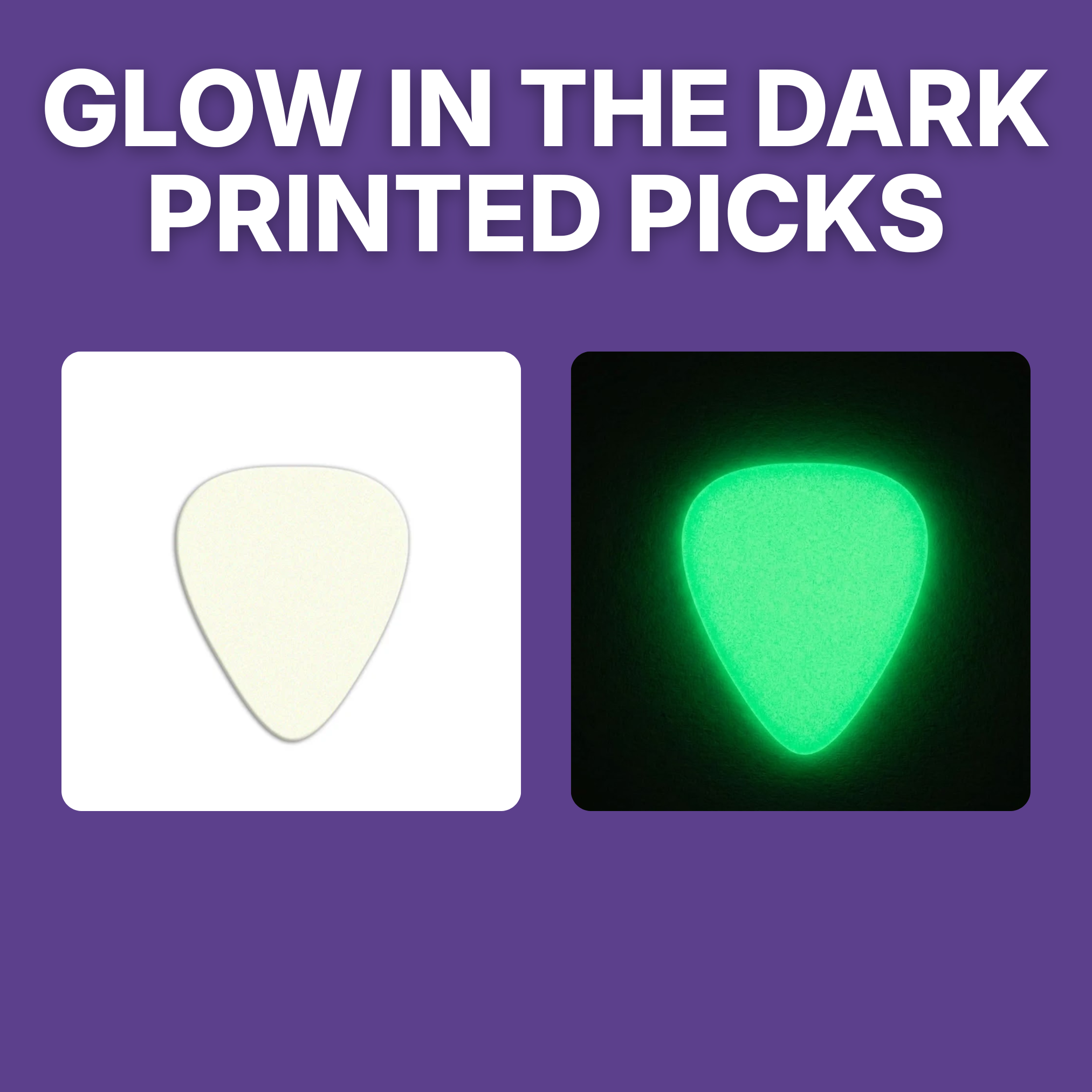 Our glow in the dark picks are made from high quality celluloid material in an off white glow in the dark colour. They glow bright green in the dark! We can print logos, text and line drawings onto our glow in the dark picks. Single sided printing only, choose from 4 different gauges.