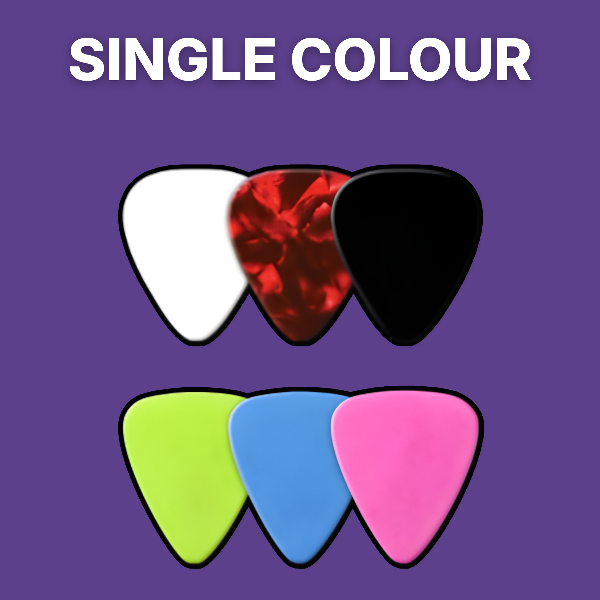 We can print logos, text and line drawings. This type of printing is only available for 1 colour artwork. Our entire range of pick materials, shapes (excluding Jazz XL & Large Triangle, please choose Full Colour Printing for these shapes), gauges and colours are available for single colour printing.