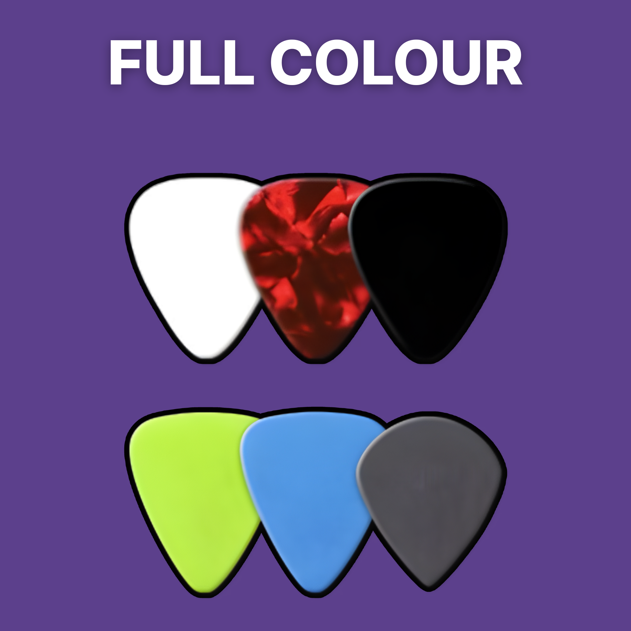 We can print just about anything onto your custom picks! Logos, art, text, drawings and even photos can be printed onto our huge selection of pick materials, shapes, gauges and colours! This full colour printing method can cover the entire surface of the pick from edge to edge.
